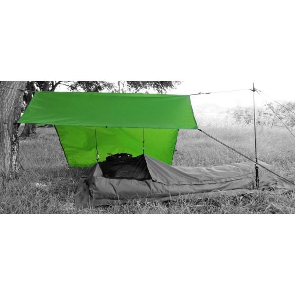 2本のポールとパラコードを使って設営します。張った際に見た目がカッコ良く設営が簡単なタープですが、面積が然程広くありません。アレンジをする事でテントと連結して使うなどが出来るのが便利です。