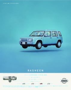 なでしこのお姉さんが乗っている車は「日産 ラシーンのカスタムカー」になります。ノーマルは写真の通りでフロントフェイスがもっと優しい顔をしています。この日産ラシーンは1994年から2000年の6年間発売。名前の由来は「羅針盤」からの造語。発売当初のメーンキャラクターはドラえもんです。ちなみになでしこお姉さんの車の色は通称「ドラえもんブルー」と呼ばれます。